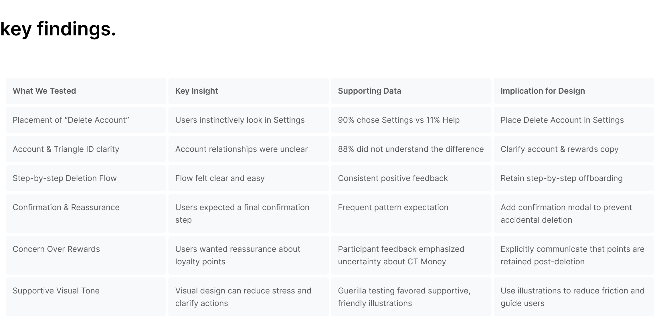 Information Architecture Testing: Ran a digital card-sorting exercise to understand where users expected to find account deletion.