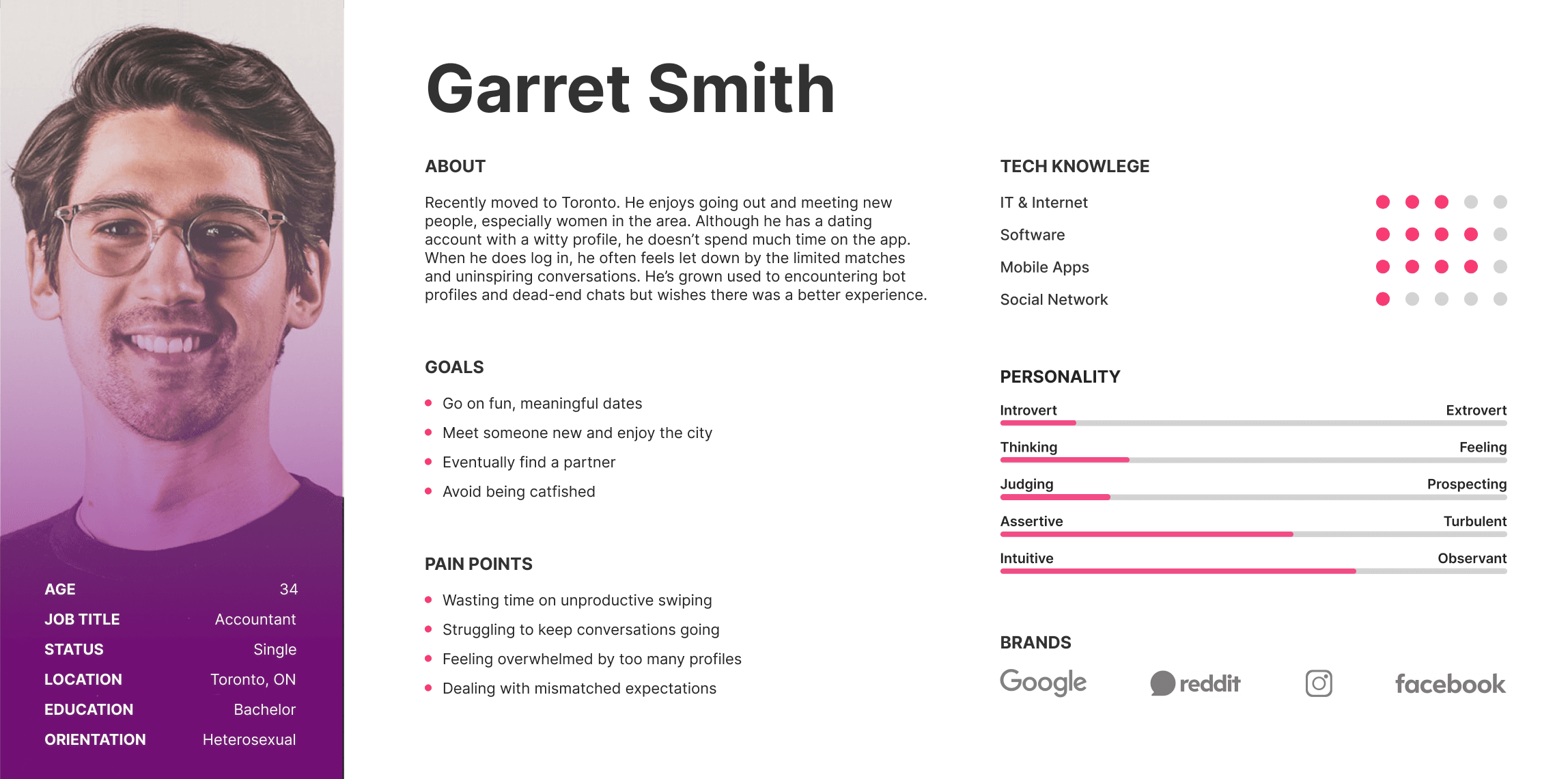 I downloaded and created accounts on the direct and indirect competitor's apps, and analyzed their strengths and weaknesses. I looked at several rival services, including other offerings from the Match Group, the company behind Tinder.